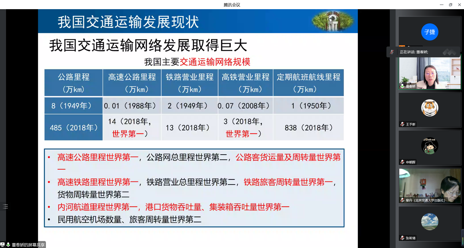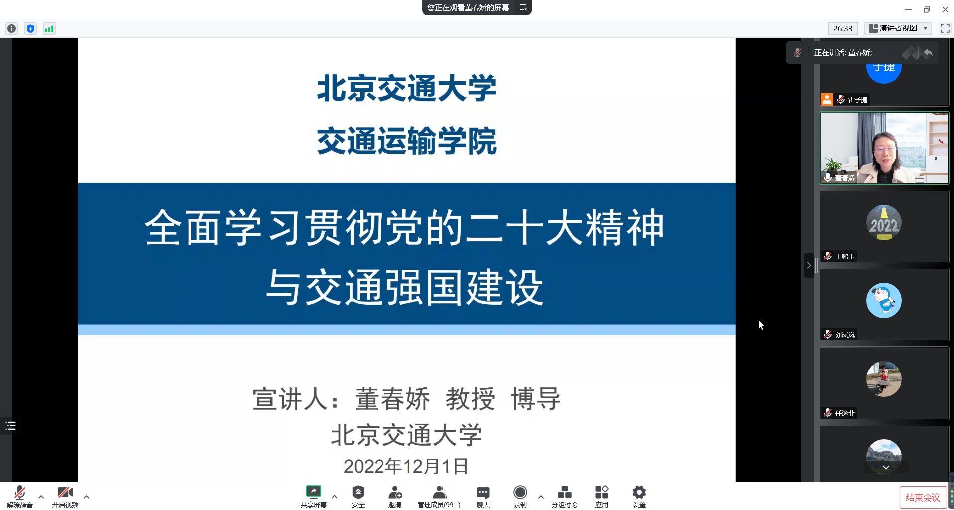 宣讲会上,董春娇教授系统分析了党的二十大报告中15个部分内容,深入浅出地解读了二十大报告中的新提法、新要求,提纲挈领地将二十大报告总结为1到9个重点,使得老师们、同学们更好的了解二十大报告精神。在宣讲中,董教授运用丰富的专业知识分析解读了我国交通强国建设,结合自身所学利用大量数据讲解我国现阶段交通运输网络存在的问题,并根据团队的研究成果提出可行方法解决问题。