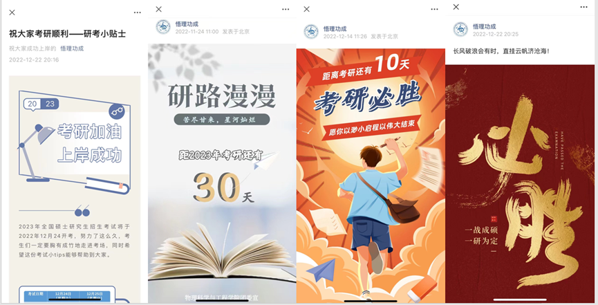 学院通过员工宣传平台“悟理功成”制作考研加油倒计时海报和考研小贴士,为考研考生加油打气。