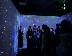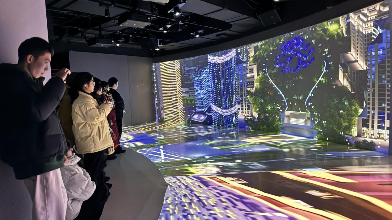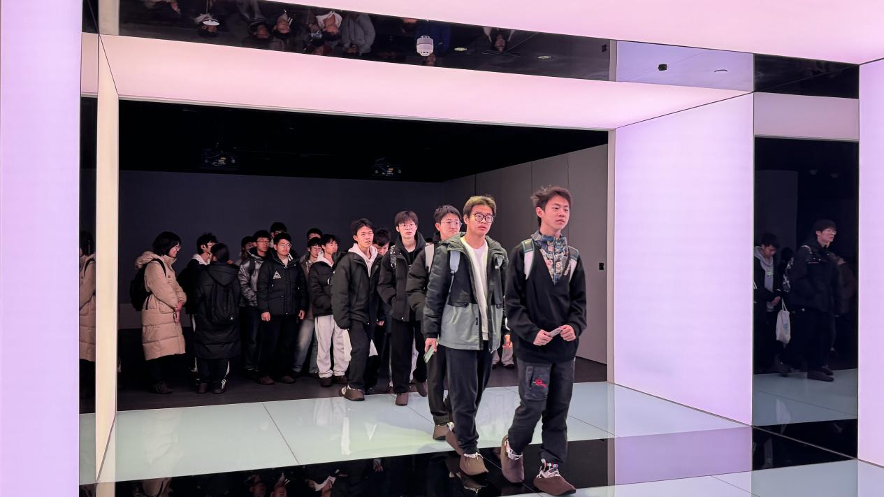 走过10万根光纤模拟而成的浪漫而美丽的走廊,同学们来到展厅的第三部分。首先步入“室内光环境”,应用光自适应系统,根据室外光线调节室内灯光,联动电光窗帘,以达到节能效果。“室内花园”则用补光灯模拟太阳全光谱,在没有阳光的区域也能正常养殖蔬果。最后,在城市会客厅中,四面投影将同学们包围,展示了“夜游瓯江”与“北京中轴线”两个影片,同学们宛如身临其境,连连赞叹光的神奇。