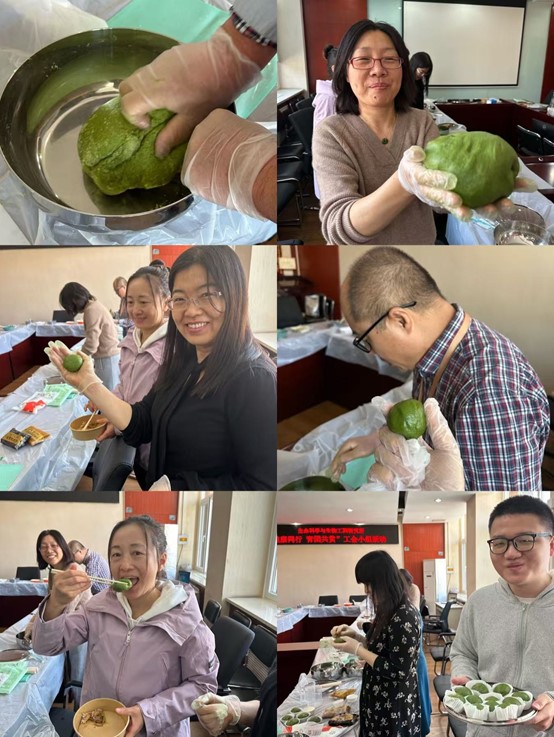 随后进行的 "传统青团制作体验" 将活动推向高潮。活动特别准备了糯米粉、艾草汁及五种健康馅料 —— 红豆沙、紫薯、芋泥、咸蛋黄肉松、椰蓉奶黄。教师们兴致勃勃地揉粉、包馅、塑形,在亲手制作传统青团的过程中,切实感受健康生活方式与中华传统文化的有机融合。值得点赞的是,老师们将新鲜出炉的青团精心包装后,赠送给生物专业研究生,用美食传递了浓浓的师生情谊。